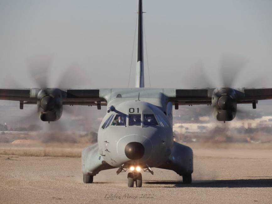 Un C-295 en carrera de despegue a toda velocidad para abandonar el aeródromo de Ablitas y recuperarse en la base aérea de Zaragoza.