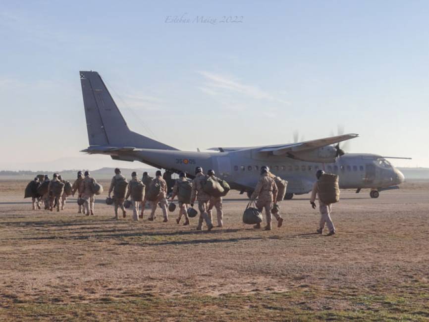 Varios paracaidistas del EADA embarcando en un C-295 para despegar de vuelta a la base aérea de Zaragoza luego de efectuar un salto en el aeródromo de Ablitas.