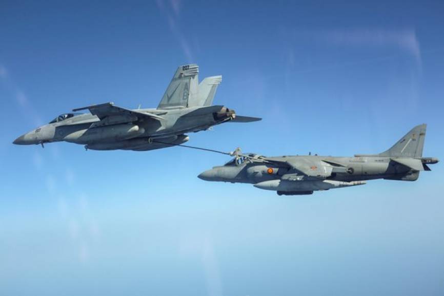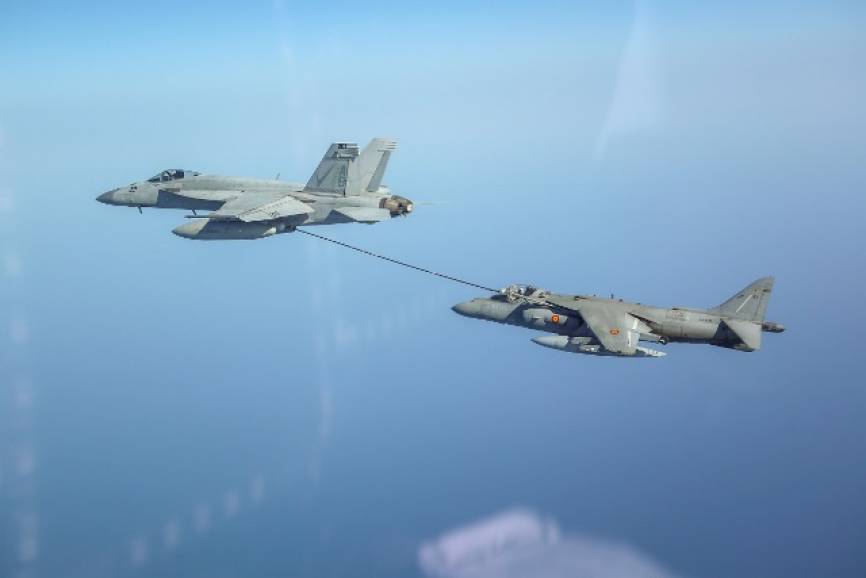 Momento en que un F/A-18E de la US Navy reposta a un Harrier español. (foto US Navy)