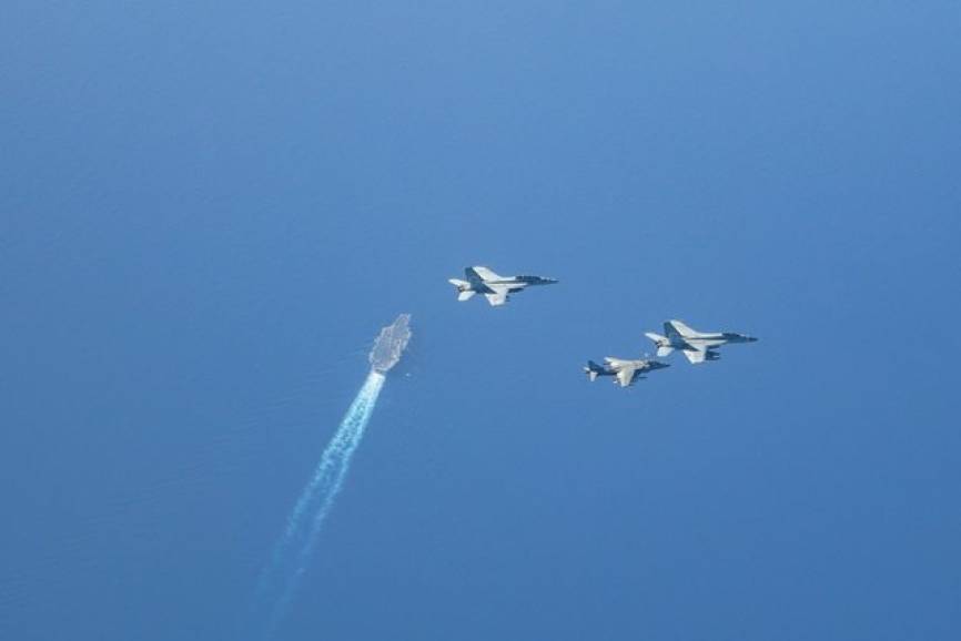 Una formación de Harrier y Súper Hornet se acercan al portaaviones “Harry S. Truman”. (foto US Navy)