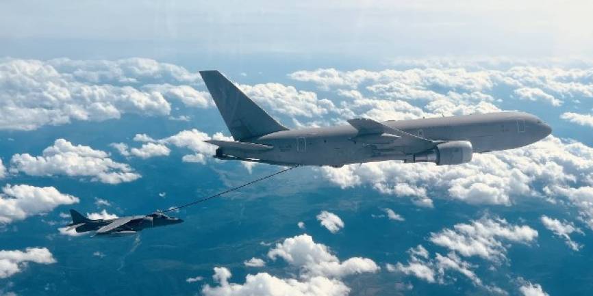 Un Harrier repostando de un cisterna Boeing KC-767A de la Fuerza Aérea de Italia. (foto Armada)