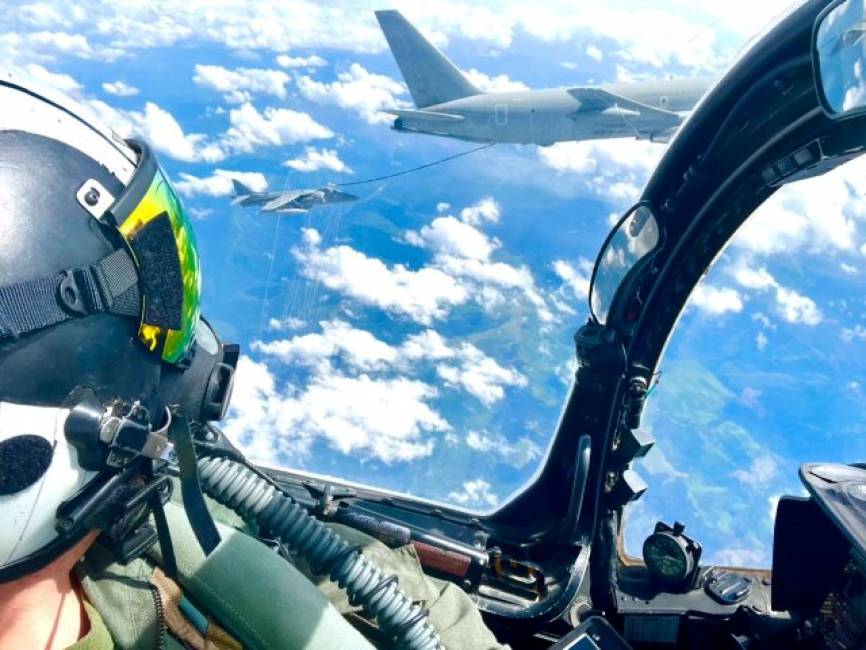 Un piloto de la Armada observa como su compañero reposta su Harrier desde un KC-767A italiano. (foto Armada)