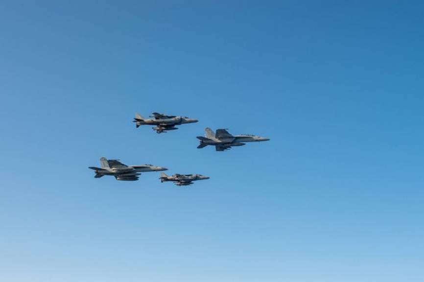 Formación compuesta por dos “Harrier” y sendos F/A-18E (monoplaza) y un F/A-18F (biplaza). (foto US Navy)