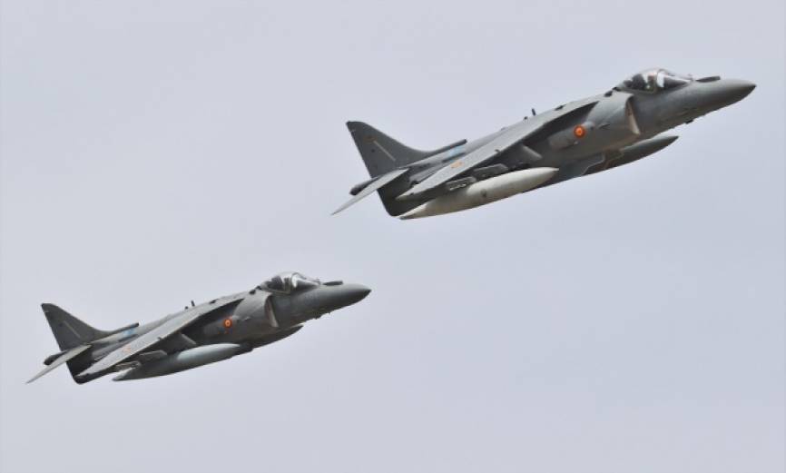 Dos cazabombarderos “Harrier” de la Armada simulando una misión de apoyo aéreo cercano a la fuerza de desembarco.