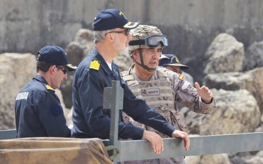 El general José Luis Souto, actualmente al mando del TEAR, explicando los detalles del desembarco al Rey Felipe VI.