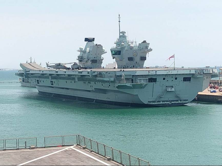 El “Prince of Wales” saliendo de la base de Rota, en primer plano la cubierta del navío anfibio español “Castilla”.