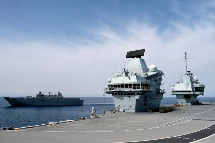 Un helicóptero español “Sea King” sobrevuela el “Prince of Wales”, en cuya cubierta vemos un Leonardo “Merlin”.