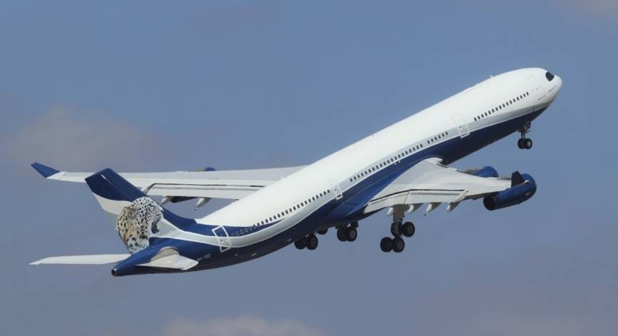 El Airbus A340 de la compañía Hi Fly, que participó en el festival con la insignia de una unidad de combate de la FAP, la de los “Jaguares” pintada en la cola.