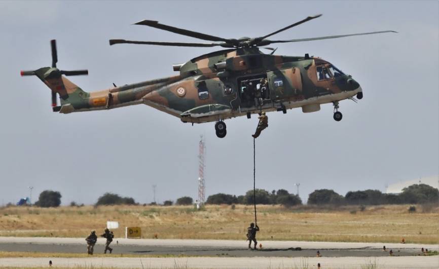 Un helicóptero Leonardo EH101 de la 751 “Esquadra” de la FAP del que bajan fuerzas especiales.