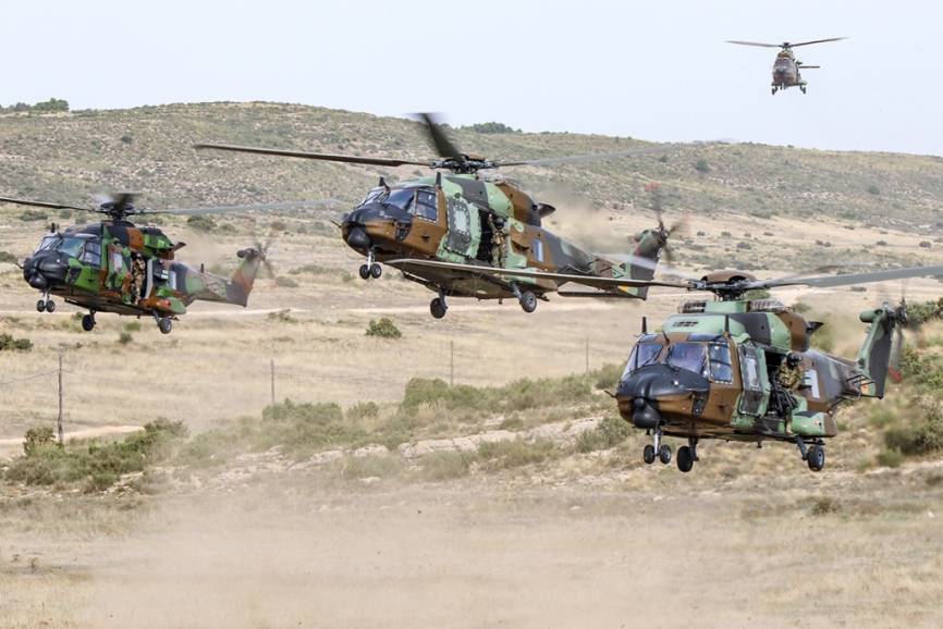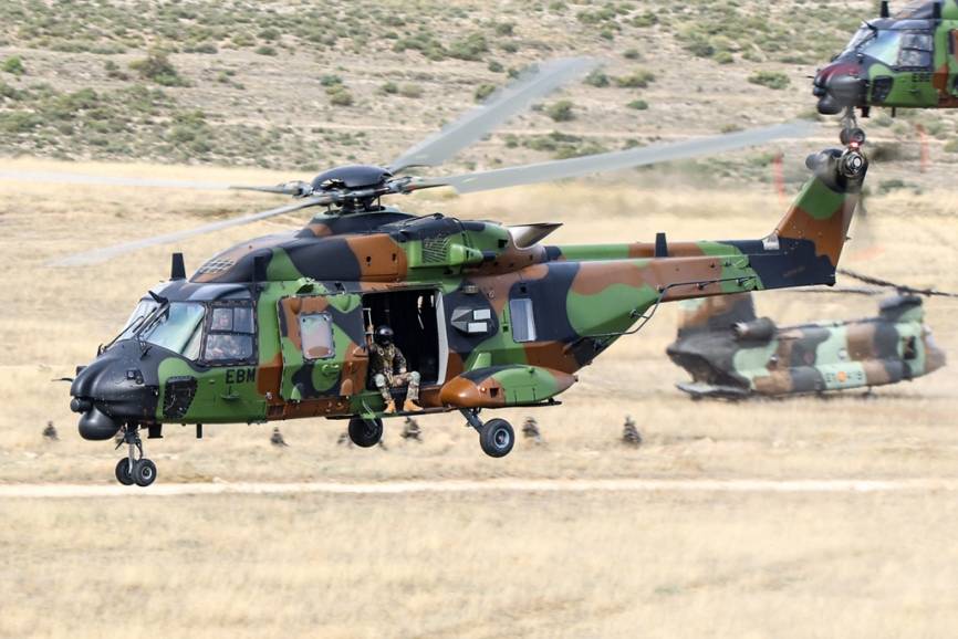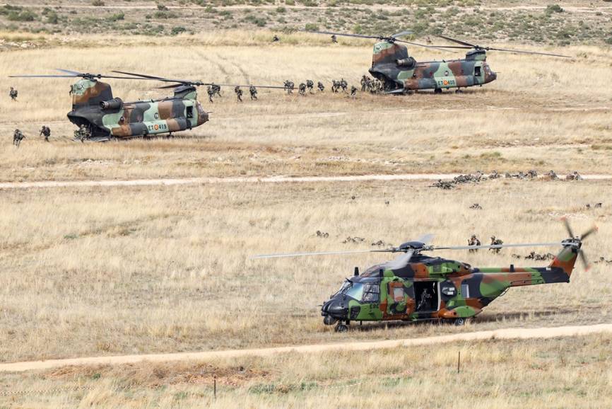 Tres helicópteros NH90 llegando a la zona designada para el asalto aéreo. (Rubén Galindo)