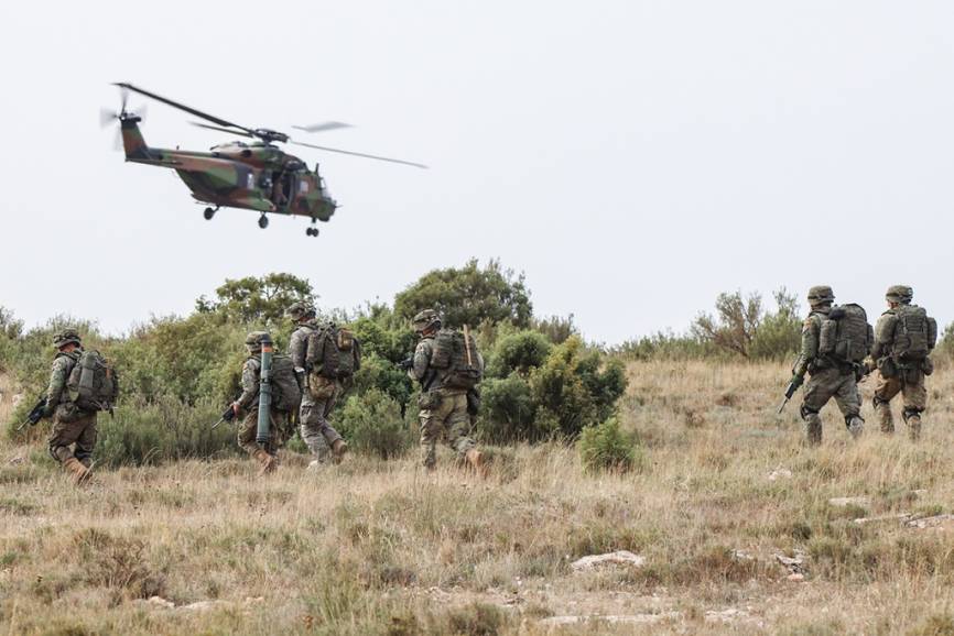 Un grupo de miembros de la BRIPAC avanzan tras descender de un NH90. (Rubén Galindo)
