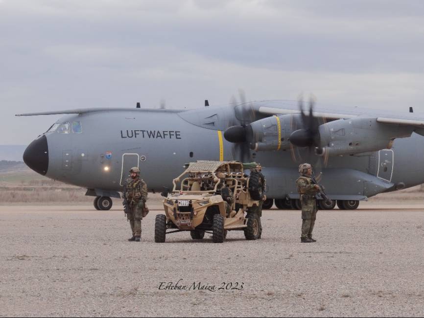 Un A-400M de la Luftwaffe insertando un vehículo ‘Polaris’ bajo la protección de un equipo AMPT alemán.