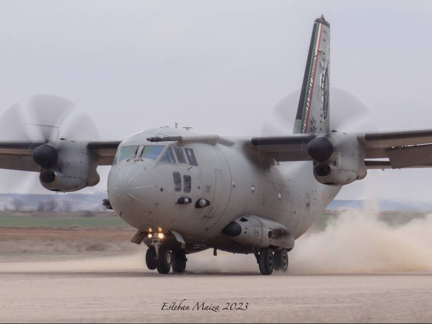 Un C-27J Spartan de la Aeronautica Militare ejecutando una toma de máximo esfuerzo.