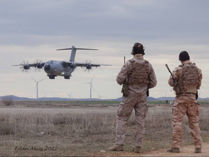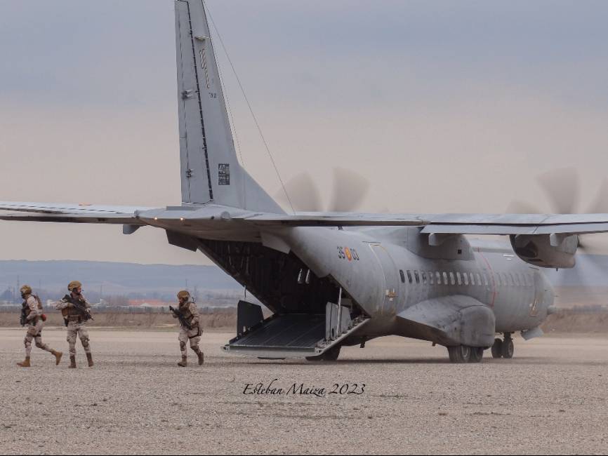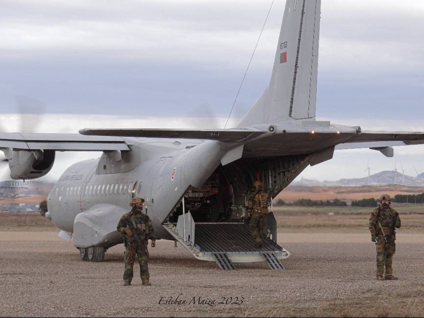 Un C-295 del Ejército del Aire operando en Ablitas mientras el AMPT del EADA asegura la zona.