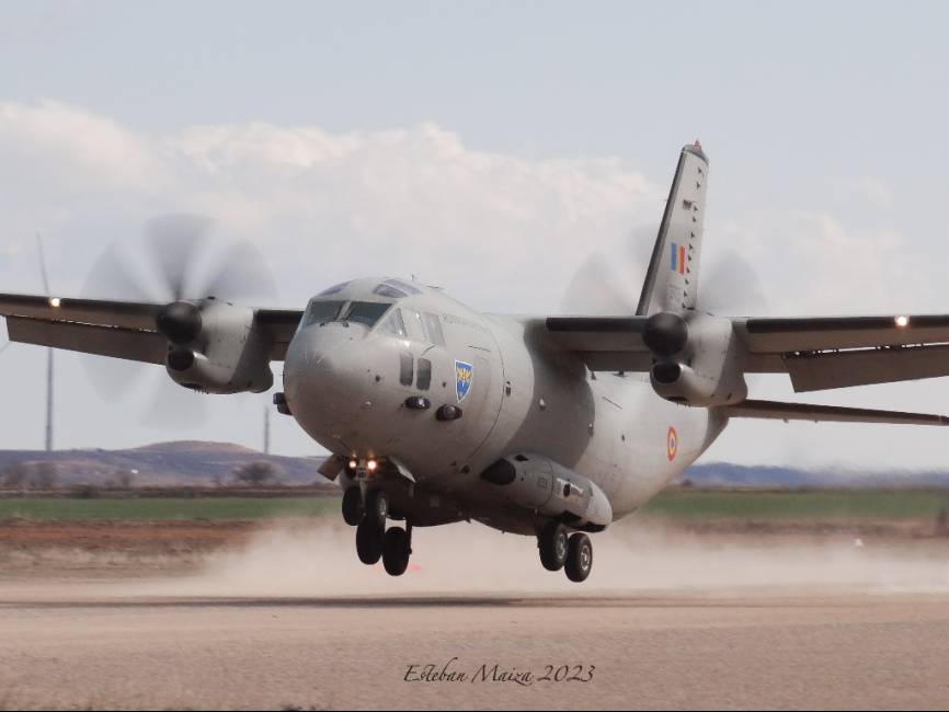 Un C-27J rumano durante una aproximación táctica sin aterrizaje.