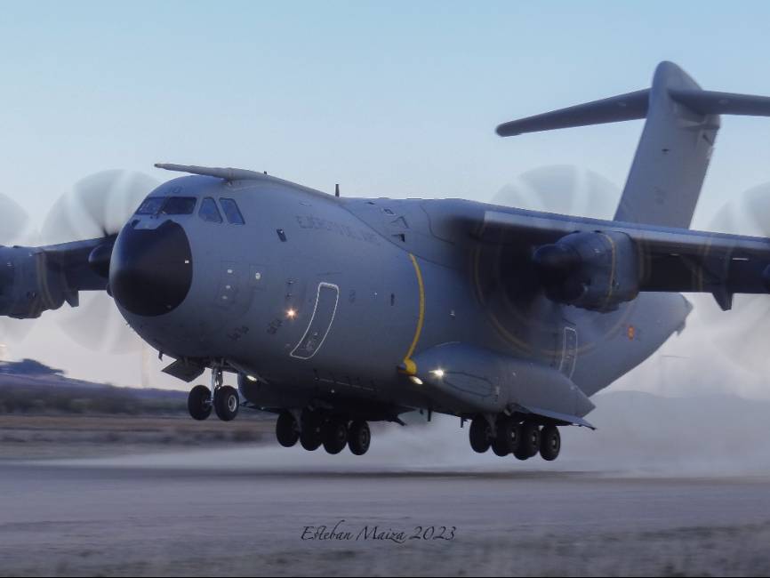 Un A-400M del Ejército del Aire a punto de aterrizar en pista de tierra.
