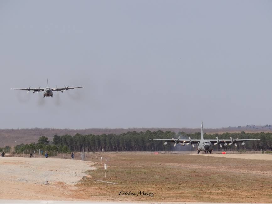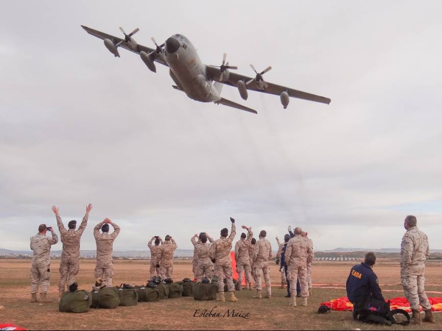 Un KC-130H del Ala 31 efectuando una pasada de despedida sobre el aeródromo militar de Ablitas mientras paracaidistas del EADA se despiden de él tras efectuar el último lanzamiento paracaidista de la historia desde un Hércules español, el 30 de diciembre de 2020.