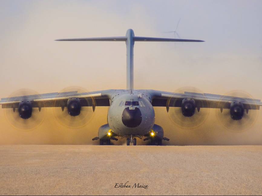 Un A-400M del Ala 31 metiendo reversa con sus cuatro motores para frenar durante una toma de máximo esfuerzo en pista de tierra.