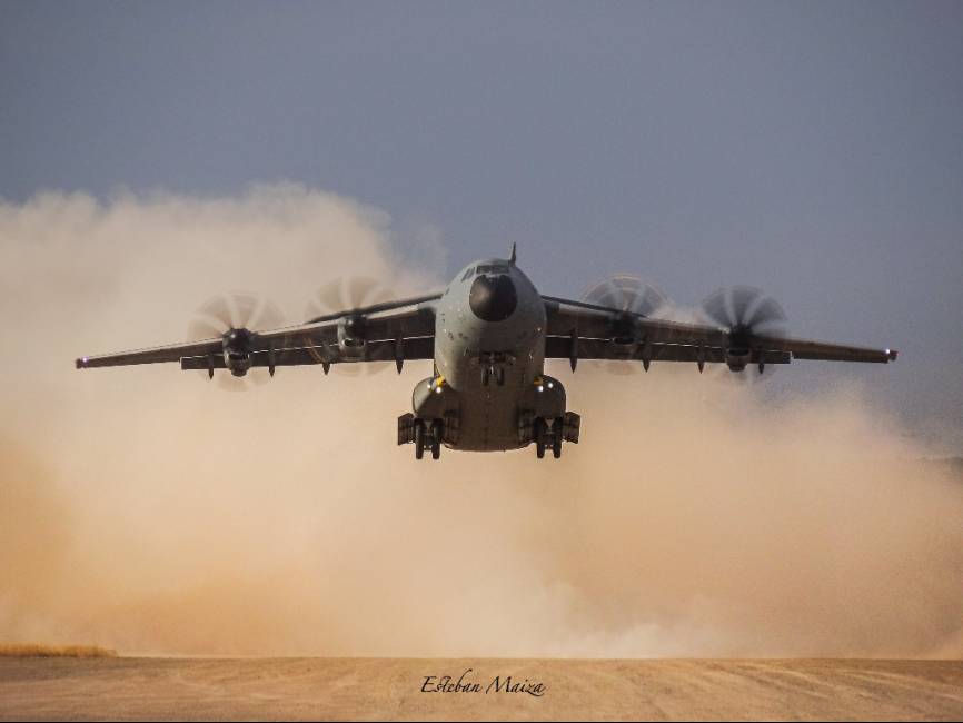 Un A-400M operando en pista de tierra durante un ejercicio de tomas de máximo esfuerzo.