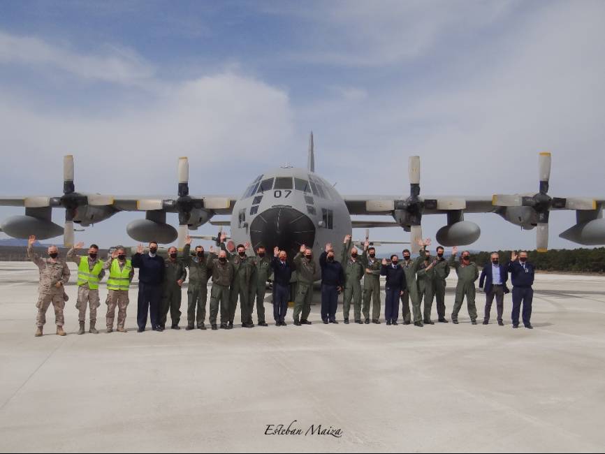 Las tripulaciones encargadas de efectuar el último vuelo de Hércules con otros componentes del Ala 31 saludando, en el día que se cerró la historia del Hércules en España.