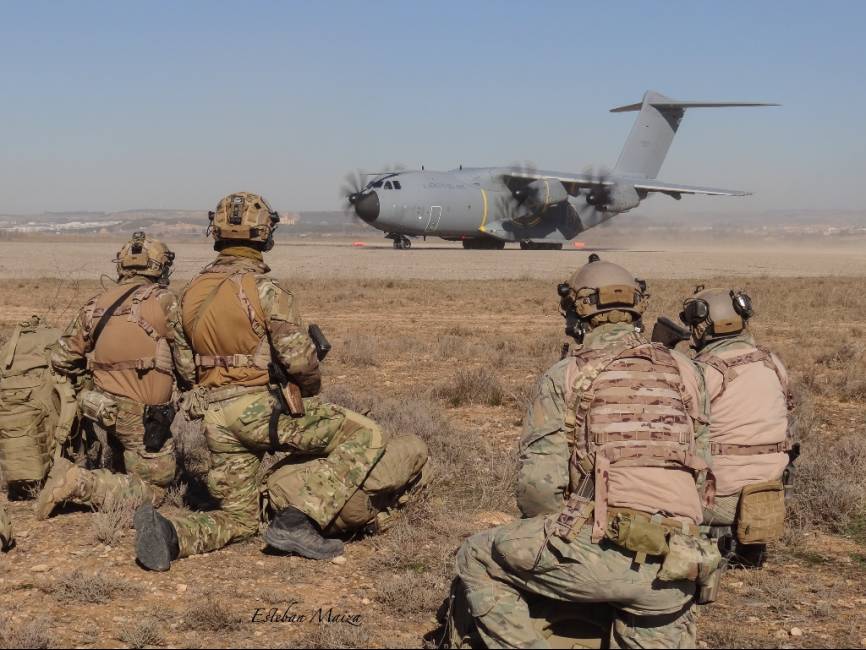 Operadores del EZAPAC dando seguridad a la zona de operaciones de un A-400M en una misión de apoyo a operaciones especiales, otro rol que el T.23 ya ha demostrado ser capaz de ejecutar.