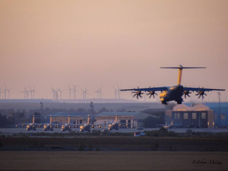 Uno de loa A-400M que participó en la misión de evacuación de Kabul a punto de aterrizar en la base aérea de Zaragoza, donde la plataforma del Ala 31 está llena de estos aviones en mitad del atardecer.