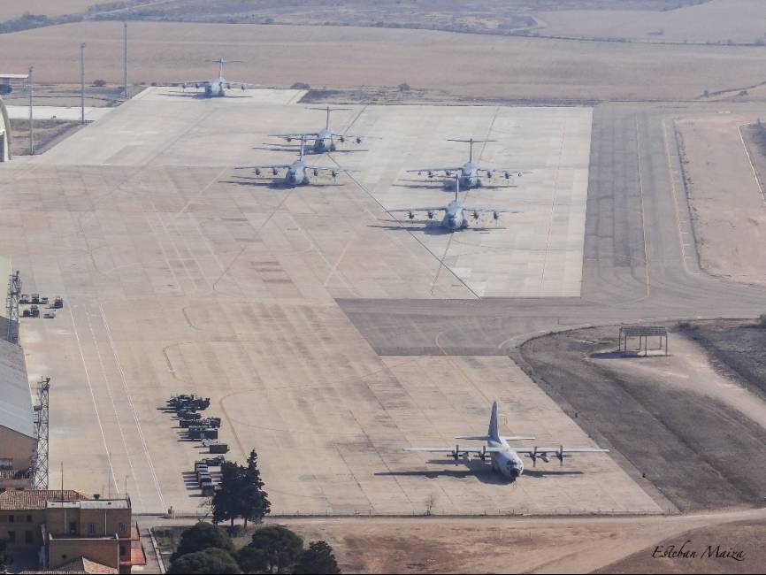 Plataforma del Ala 31 vista desde un helicóptero a día de hoy, con varios A-400M y un Hércules, el T.10-10, que permanecerá en la base aérea de Zaragoza a modo de reliquia.
