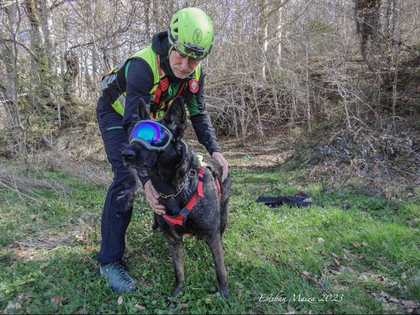 La perra de rescate ‘Roxi’ con su guía durante una práctica de búsqueda y rescate en aludes.