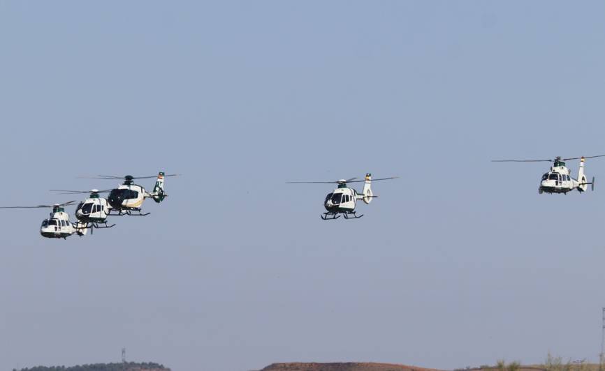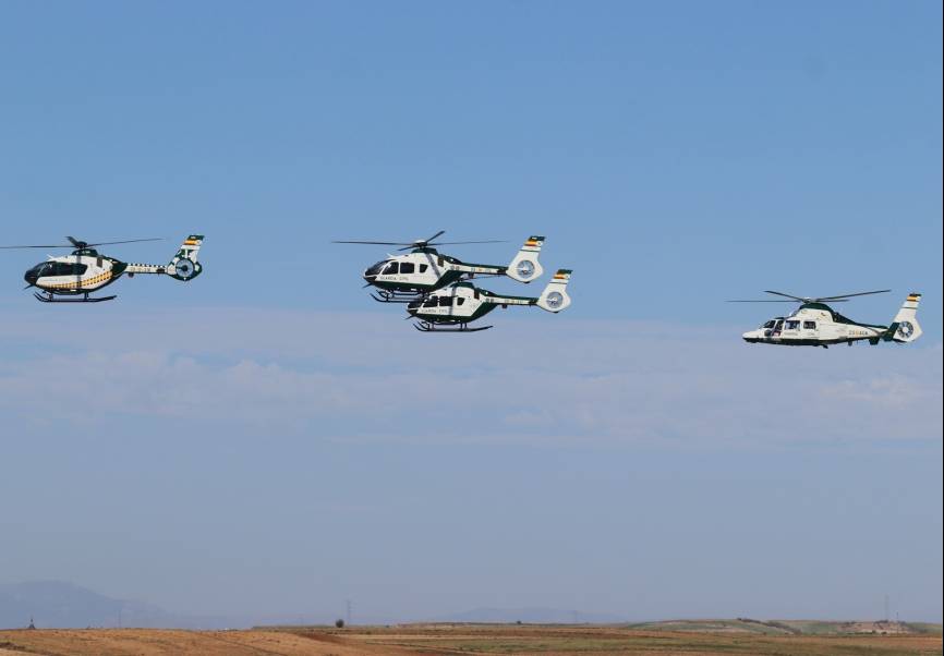 La formación de helicópteros de la Guardia Civil pasan por encima de la base central del SAER sita en Torrejón (Madrid).