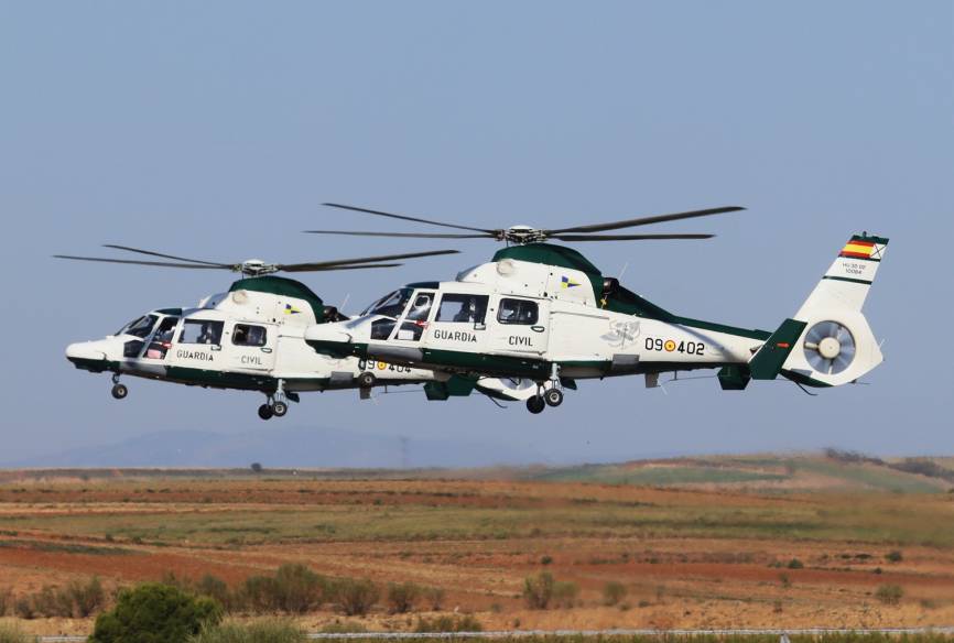 Una formación de dos helicópteros del SAER, delante un moderno H135 seguido por un AS365N3 “Dauphin” 2.