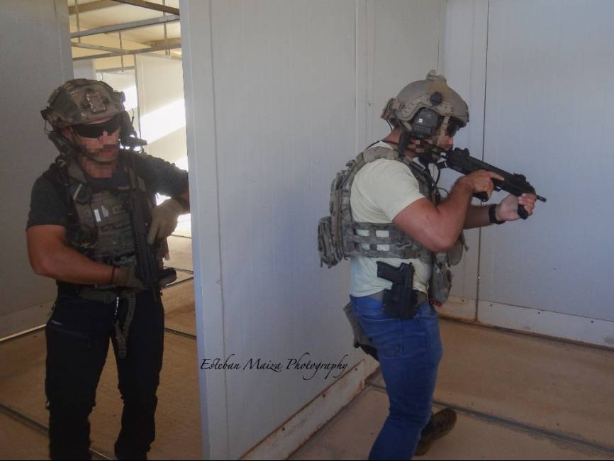 Un operador dando seguridad en la puerta de un inmueble para cubrir al resto del equipo operativo mientras capturan a un objetivo.