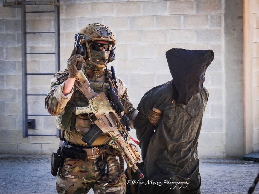 Un operador del MOE conduciendo a un objetivo de alto valor (HVI) detenido durante una operación.