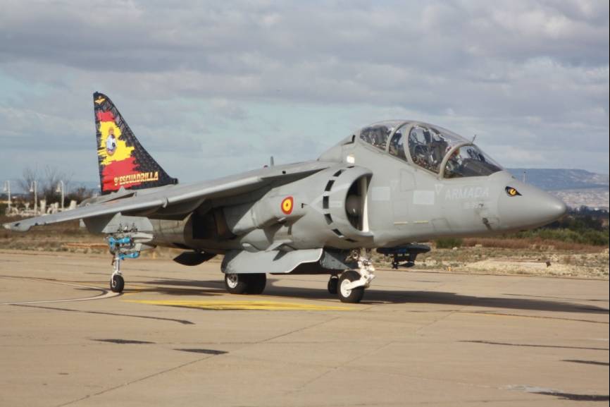 El único “Harrier” II biplaza de la Novena Escuadrilla, el TAV-8B con indicativo 01-999 carreteando en Zaragoza, llevando las bombetas Mk-76.