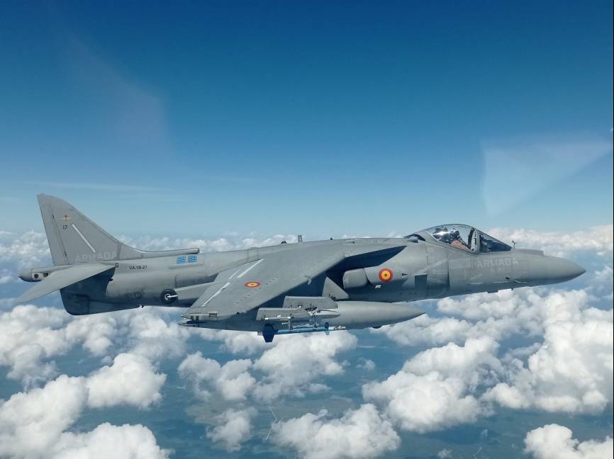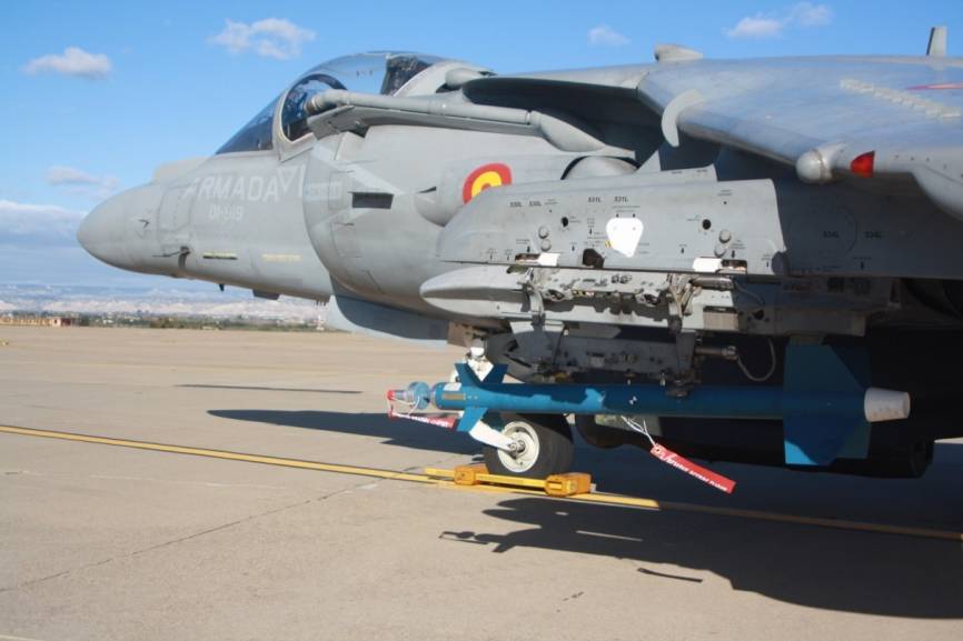 Uno de los AV-8B “Harrier” II portando un misil LGTR, en los soportes sitos bajos las alas. (foto Armada)