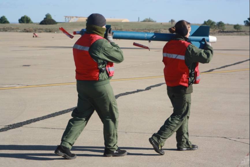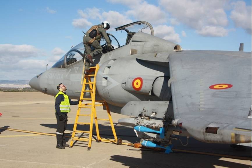 Hasta 57 mecánicos, incluidos estos especialistas en armamento, aseguraron en el suelo las operaciones de los AV-8B+ y el TAV-8B destacados en Zaragoza.