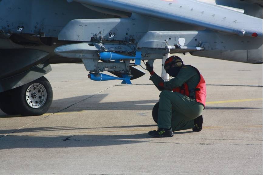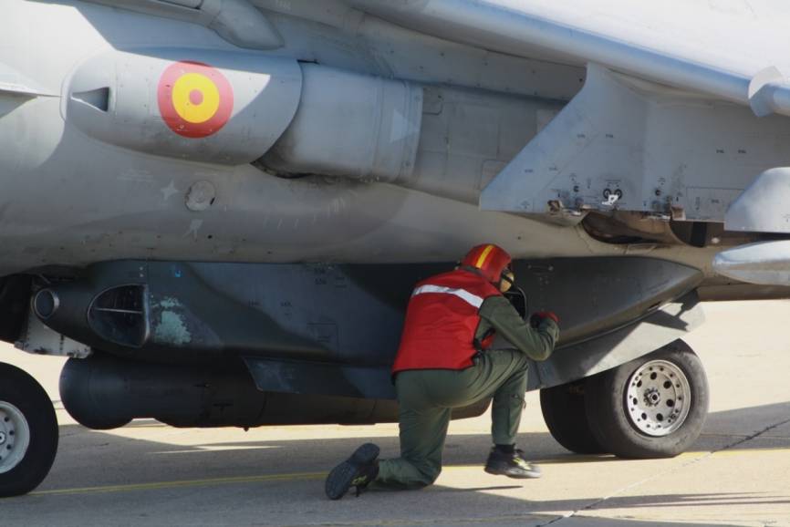 Uno de los armeros de la Novena Escuadrilla revisa si están bien instaladas las bombetas MK-76 en el AV-8B, que las va lanzar sobre Bardenas Reales.