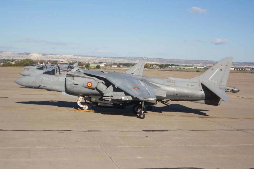Tres de los “Harrier” II estacionados en la plataforma de la base aérea de Zaragoza.