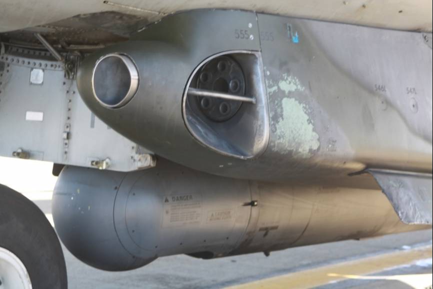 Detalle de la boca del cañón revolver de cinco tubos GAU12 de 25 mm, como se puede apreciar en la imagen, en segundo plano se ve el designador de blancos Litening de Rafael.