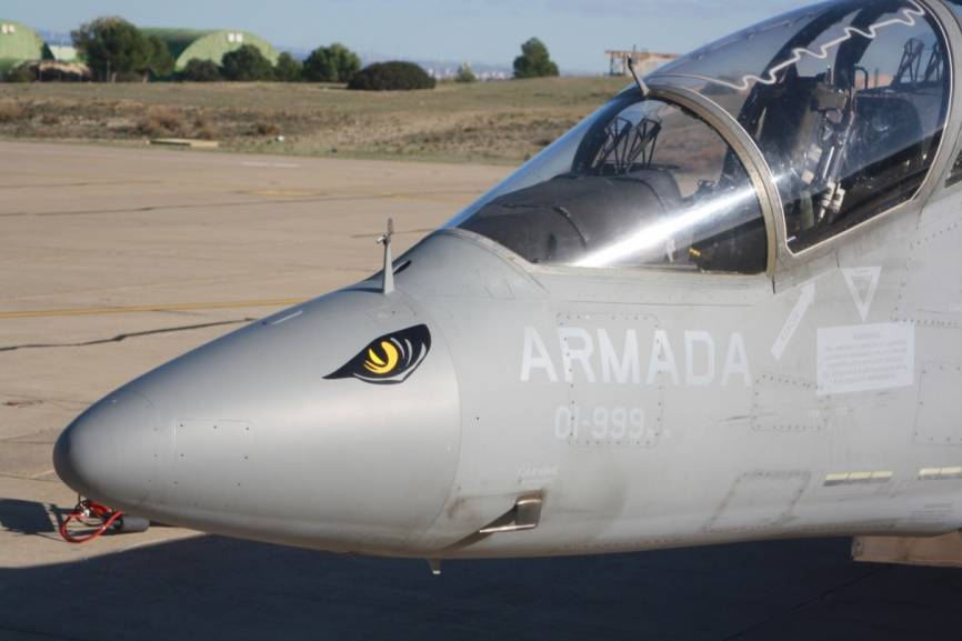 EL TAV-8B, desplazado a Zaragoza, además de la cola especialmente decorada, lleva en su morro sendos vinilos que simulan los ojos de la Cobra, que es el código radio de la Novena Escuadrilla.