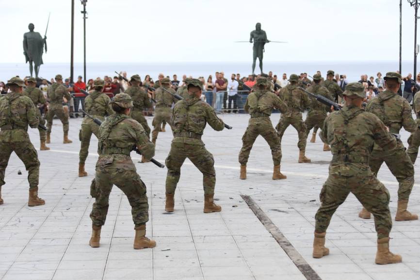 Unidad de Música del Mando de Canarias junto a la Banda de Guerra N.º 2 de la Brigada Canarias XVI desfilando. Foto archivo DIFAS 24.