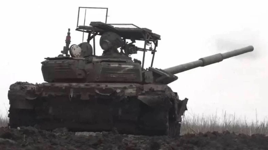 Un carro de combate T-72 ruso con un dosel de circunstancias como protección contra los drones kamikaze.