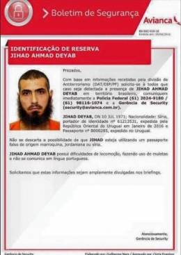 Avianca Brasil publicó un boletín de seguridad en el que pide que si alguien ve en territorio brasileño al ex preso de Guantánamo, Jihad Ahmad Diyab, fugado de Uruguay, realice un aviso a la Policial Federal. La alerta fue emitida por el resto de las aerolíneas del país.
