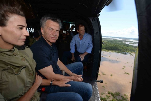 Fotografía: El presidente Mauricio Macri y la primera Dama sobrevolando las areas inundadas en un helicoptero Super Puma de la Aviacion de Ejercito.