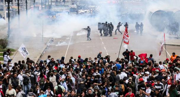 (defensa.com) Los profesores protestaban el jueves pasado contra los cambios en sus planes de pensiones que fueron aprobados por el congreso del estado de Paraná, en el sur de Brasil, en el denominado Centro Cívico, que reúne a todos los poderes regionales en la capital, Curitiba. La manifestación se tornó violenta cuando un grupo de maestros intentó romper el cordón policial que protegía el recinto legislativo y las tripas de choque de la Policía Militar pasaron a una inesperada represión violenta. Unas 215 personas resultaron heridas en los enfrentamientos.