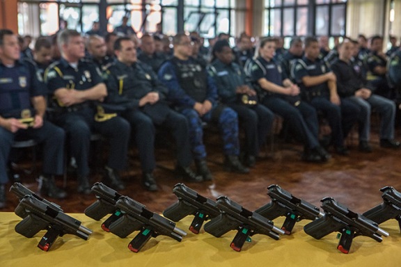 Algunas unidades municipales de seguridad brasileña utilizan pistolas calibre .40 y hasta las escopetas turcas Safir TA-14 semiautomáticas (basadas en el fusil AR-15), desde agosto autorizadas legalmente en ciudades de más de 500.000 habitantes, en forma institucional y personal, o sea que el agente puede llevar su arma personal permanentemente, esté o no en servicio. Algunos municipios, sin embargo, hasta el momento solo permiten el uso de armas no letales y bastones policiales. (Javier Bonilla)