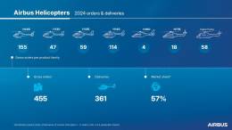 Airbus Helicopters registró en 2024 un total de 455 pedidos brutos de 182 clientes de 42 países. La compañía entregó 361 helicópteros en 2024, lo que supone una cuota preliminar del 57% del total mercado.