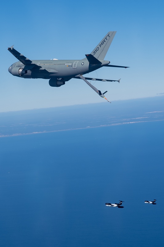 El A310 MRTT de Airbus y dos de los cinco UAVs que participaron en el ejercicio Auto'Mate (Airbus Defence and Space)