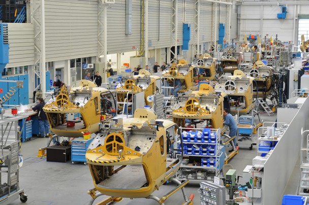 Fotografía: Línea de ensamblaje de H135 en la localidad alemana de Donauwörth (foto Charles Abarr/Airbus Helicopters).
