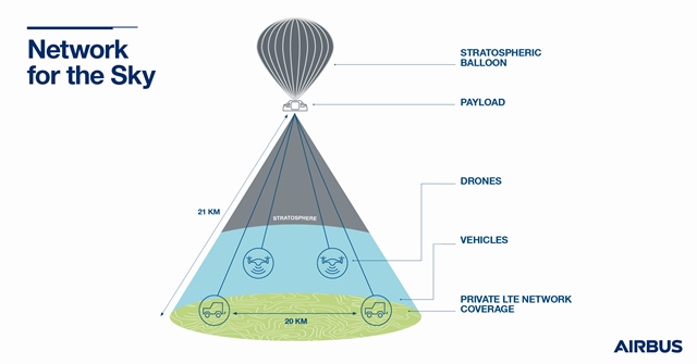 Airbus ha probado con éxito aplicaciones de defensa 4G/5G en la estratosfera por medio de una demostración en globo. La tecnología probada, un AirNode LTE de Airbus, representa una pieza clave del proyecto de comunicaciones militares aéreas seguras en red: Network for the Sky (NFTS). Con esta nueva generación de comunicaciones de largo alcance presentes en el cielo, las plataformas de gran altitud, como el Zephyr de Airbus, podrán crear células de comunicación seguras y persistentes que retransmitan información a varias plataformas de aeronaves, como helicópteros, UAV tácticos y UAV MALE (vehículo aéreo no tripulado de altitud media y largo alcance).