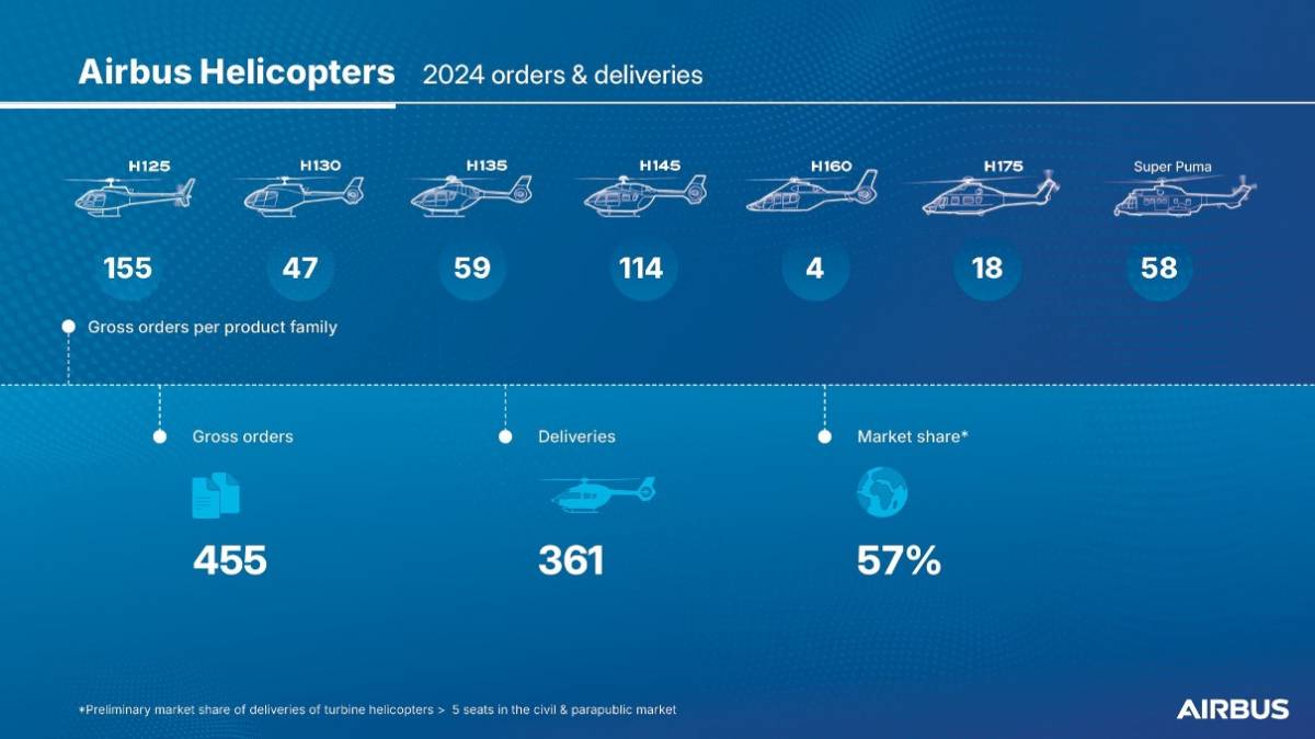Airbus Helicopters registró en 2024 un total de 455 pedidos brutos de 182 clientes de 42 países. La compañía entregó 361 helicópteros en 2024, lo que supone una cuota preliminar del 57% del total mercado.